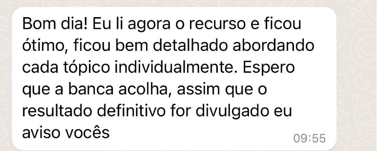 📌 Outro aluno expressou: “Ficou bem detalhado, abordando cada tópico individualmente. Espero que a banca acolha, assim que o resultado for divulgado, aviso vocês!”